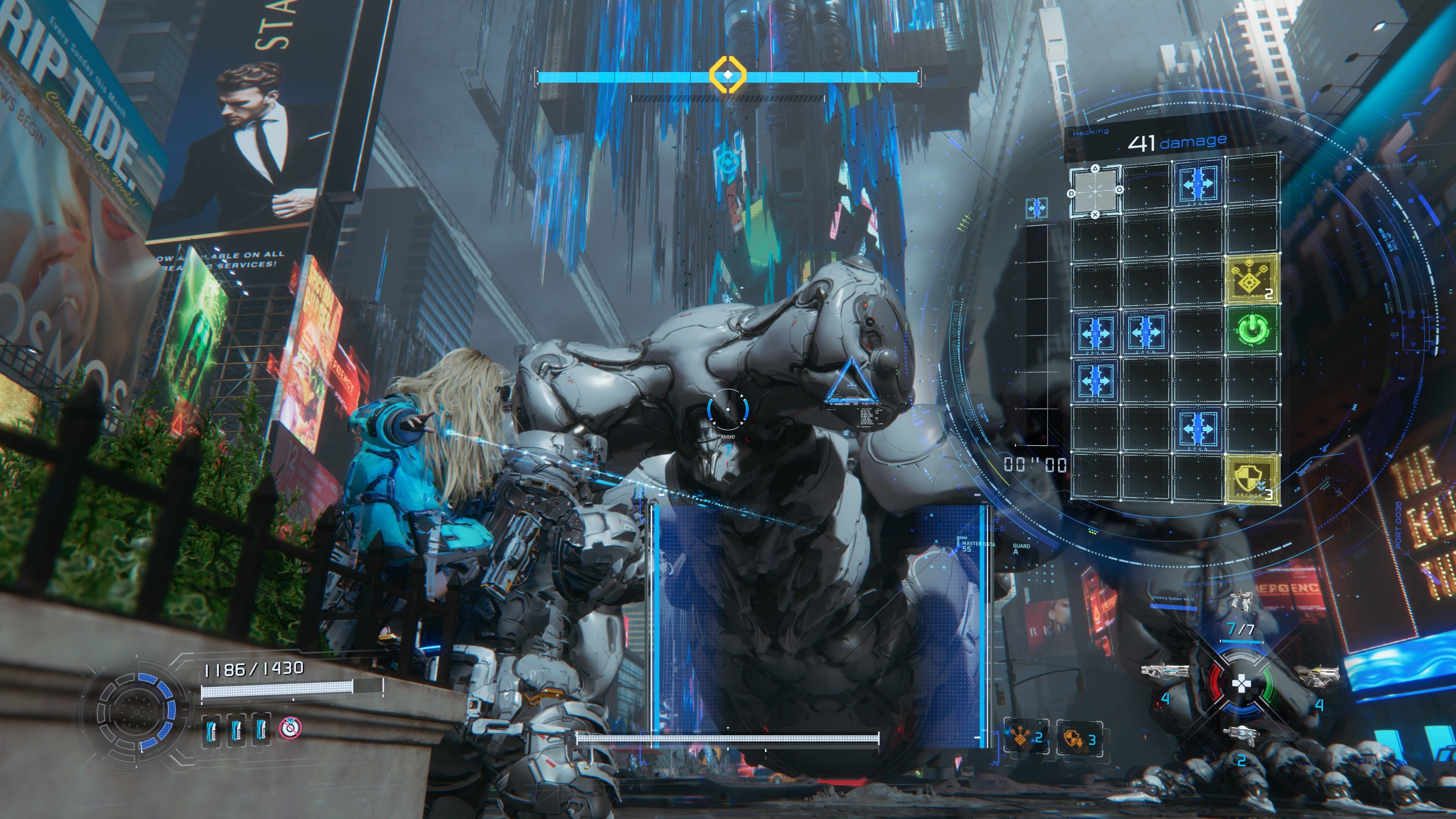 So gameplay involves Diana piggybacking on Hugh to create the best tandem offense in video games since a red breegull took a ride in a dopey bear’s backpack. The player lines Hugh up in front of an opposing robot, then triggers Diana to hack the robot to make it vulnerable. She starts a hack, producing a grid of squares on the screen through which the player must direct a cursor to impair the robot in some way, perhaps opening its protective shell. Then Hugh aims at the exposed weak spots and shoots.