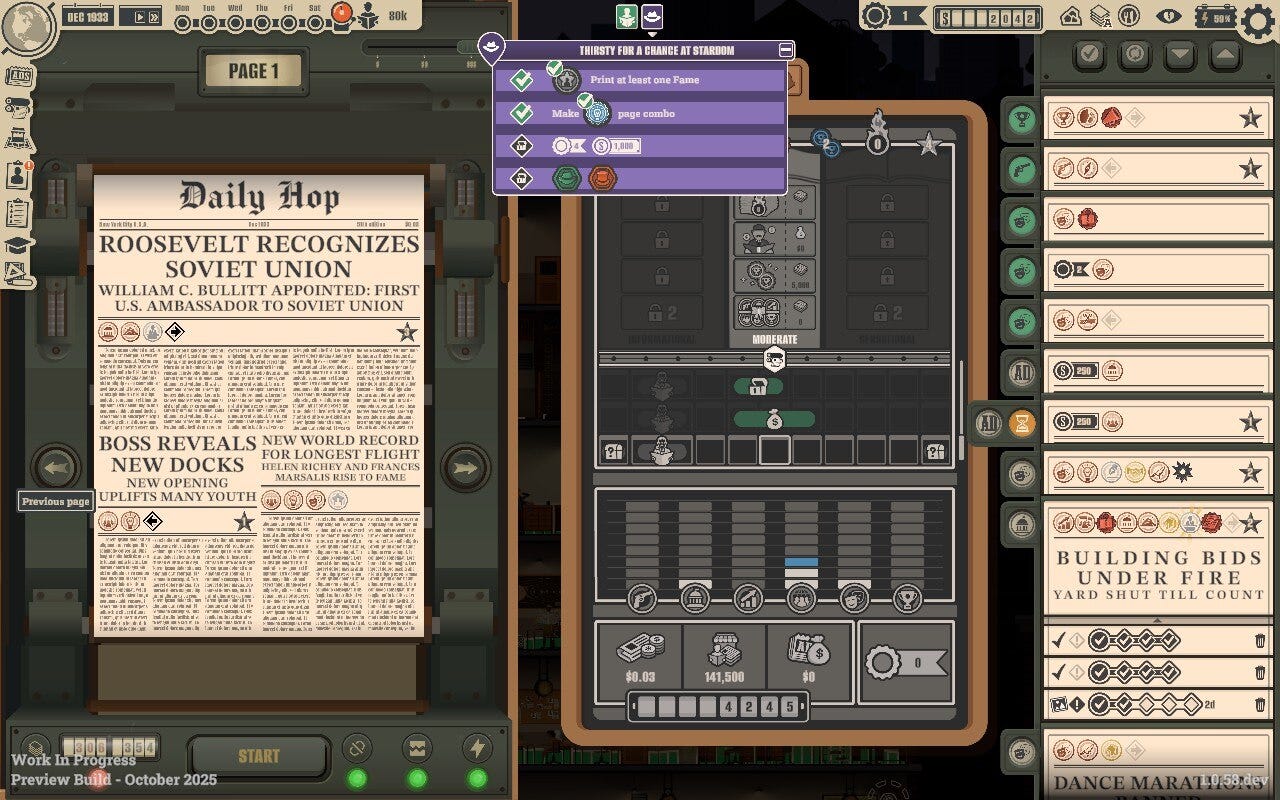 News Tower (PC) - A masterful management game about publishing a weekly newspaper in the U.S. across the full decade of the 1930s. So, so good.