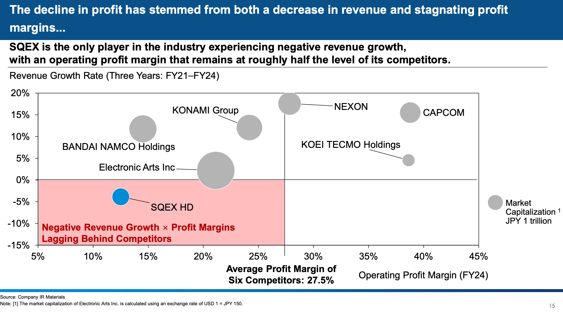 Then, this week brought more news: Activist investment group 3D Investment Partners published a brutal 112-page slideshow excoriating Square Enix for the company’s performance, calling out revenue declines, slamming its relatively poor profitability, questioning why arcade maker Taito is still even part of SquareEnix and shredding Square Enix management over the three-year plan
