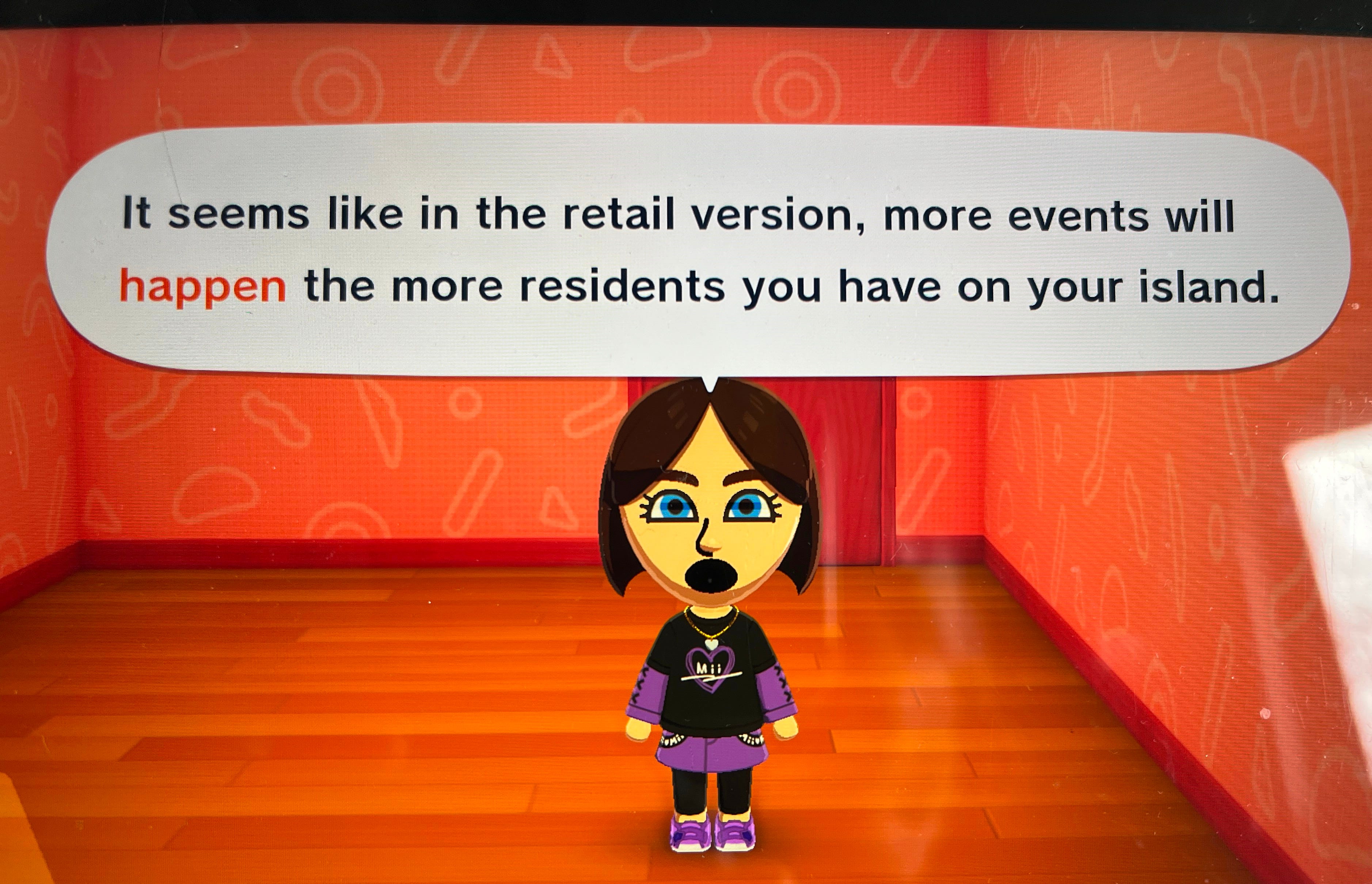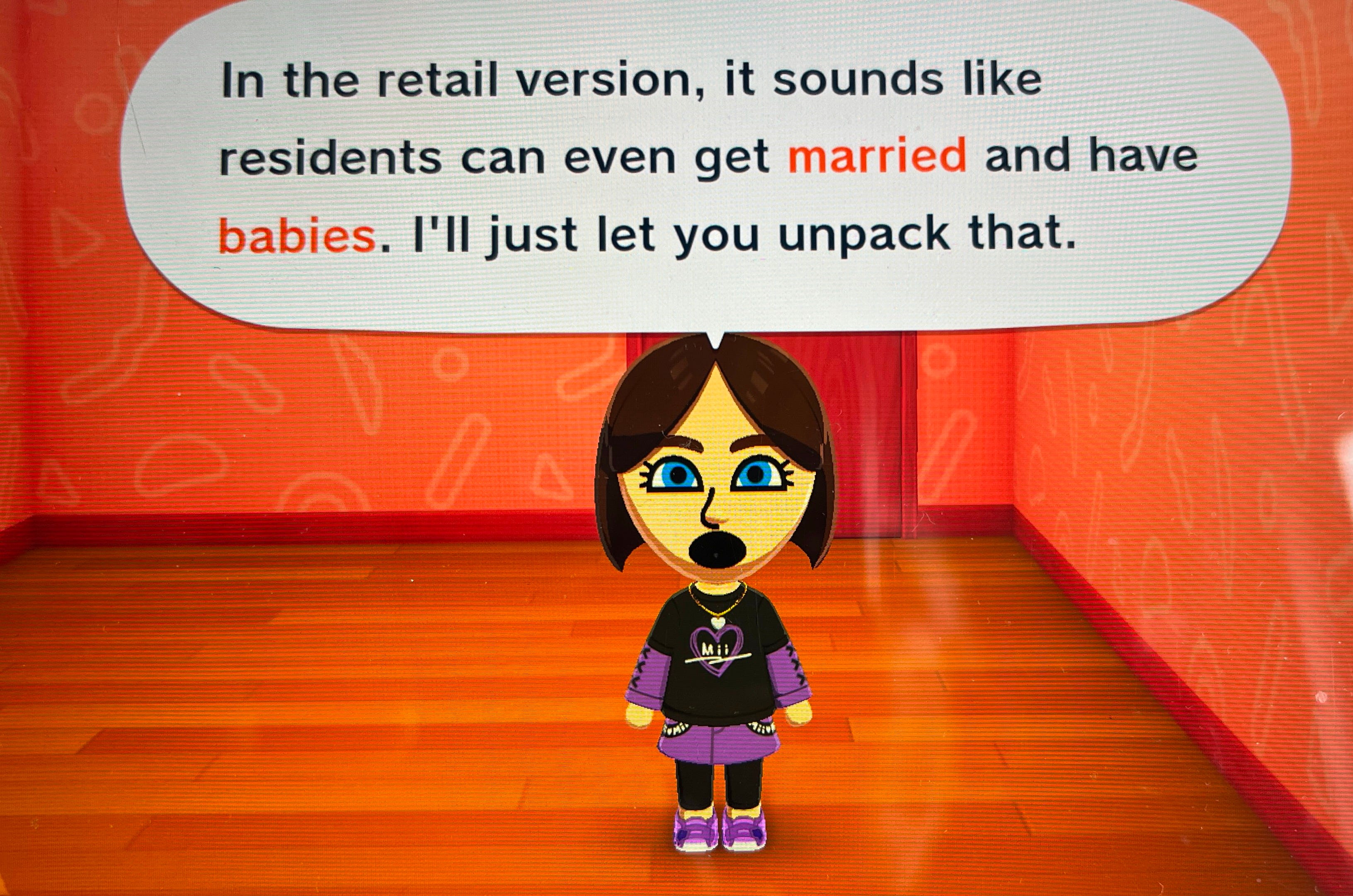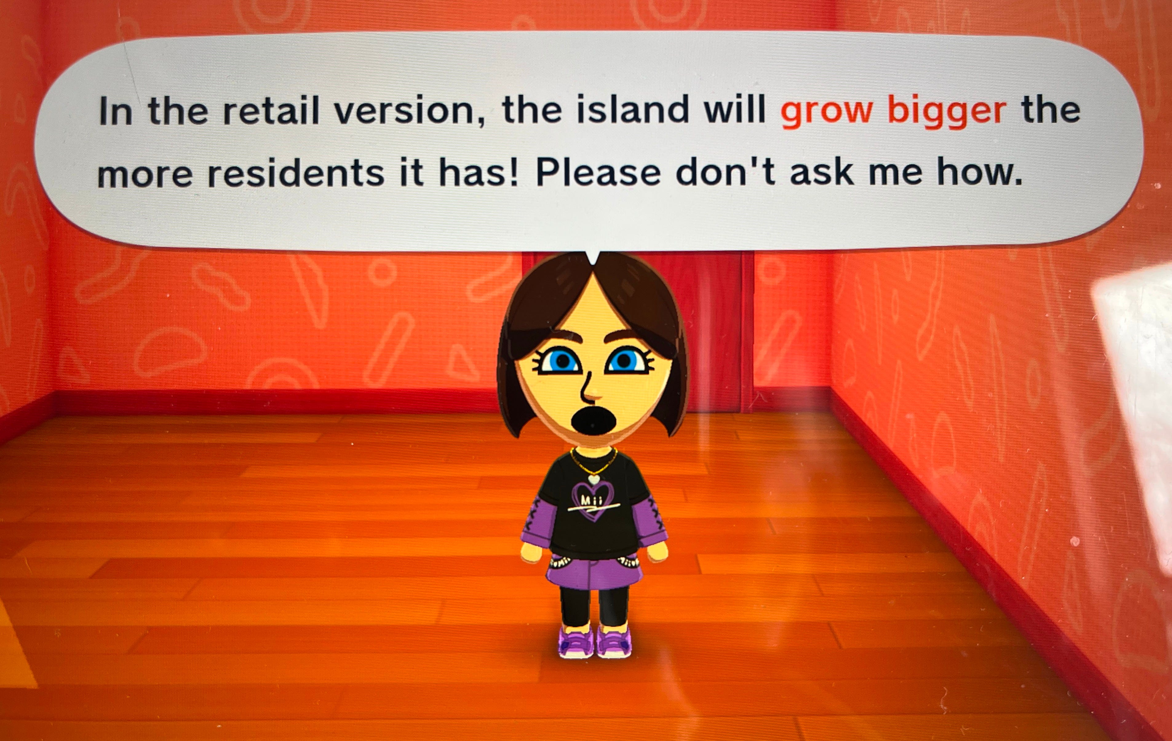 Once you’ve made your three Miis and unlocked two shops, the Miis quickly run inside and go into a loop hyping the retail version of the game…