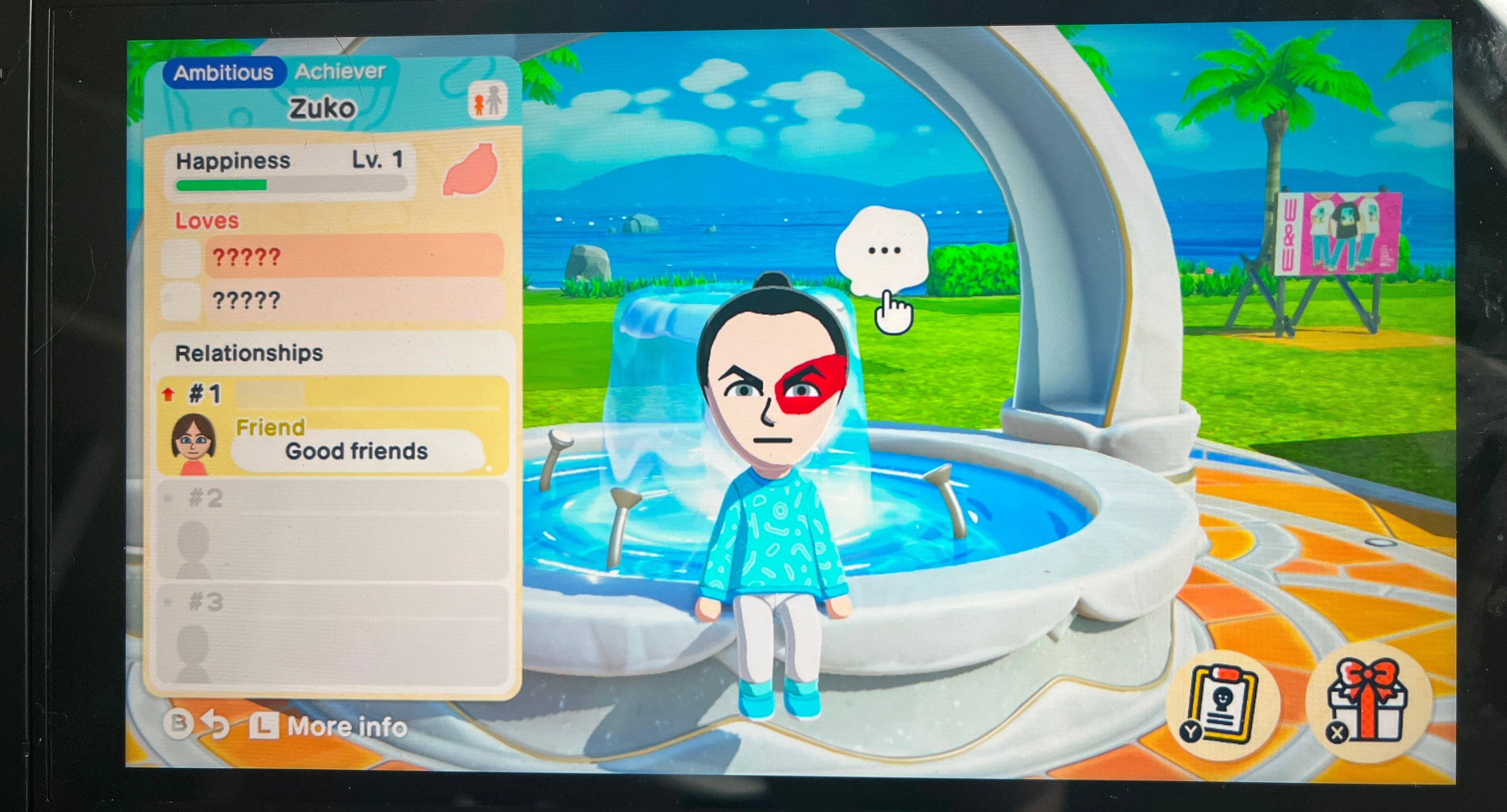 Also a bit shallow was the demo for Tomodachi Life: Living the Dream, which my daughter, as expected, loved but also finished really quickly. Living the Dream is a life simulation game from Nintendo. Players create virtual people (Miis; remember them?), give them some personality traits and then watch them interact with each other. The demo lets you make just three Miis, so my daughter created herself, Avatar the Last Airbender bad-boy Prince Zuko and a cheerleader named Gabby. She’s also taught them all how to talk about “fire-bending.”