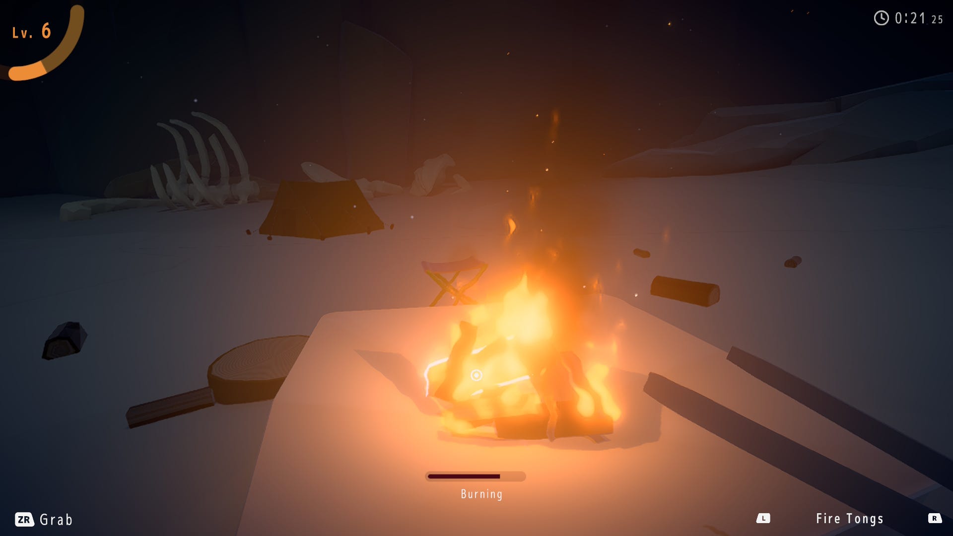 I chopped logs on a beach, piled them on (little ones first!) and blew on the fire a bit. I got my fire from a level 1 to a level 6, though not yet to the target level 10 blaze.
