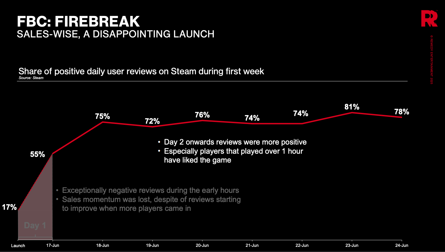 So, he had this chart, which shows that the game’s earliest Day 1 user reviews on Steam—where Remedy hoped to sell a lot of copies—were awful.