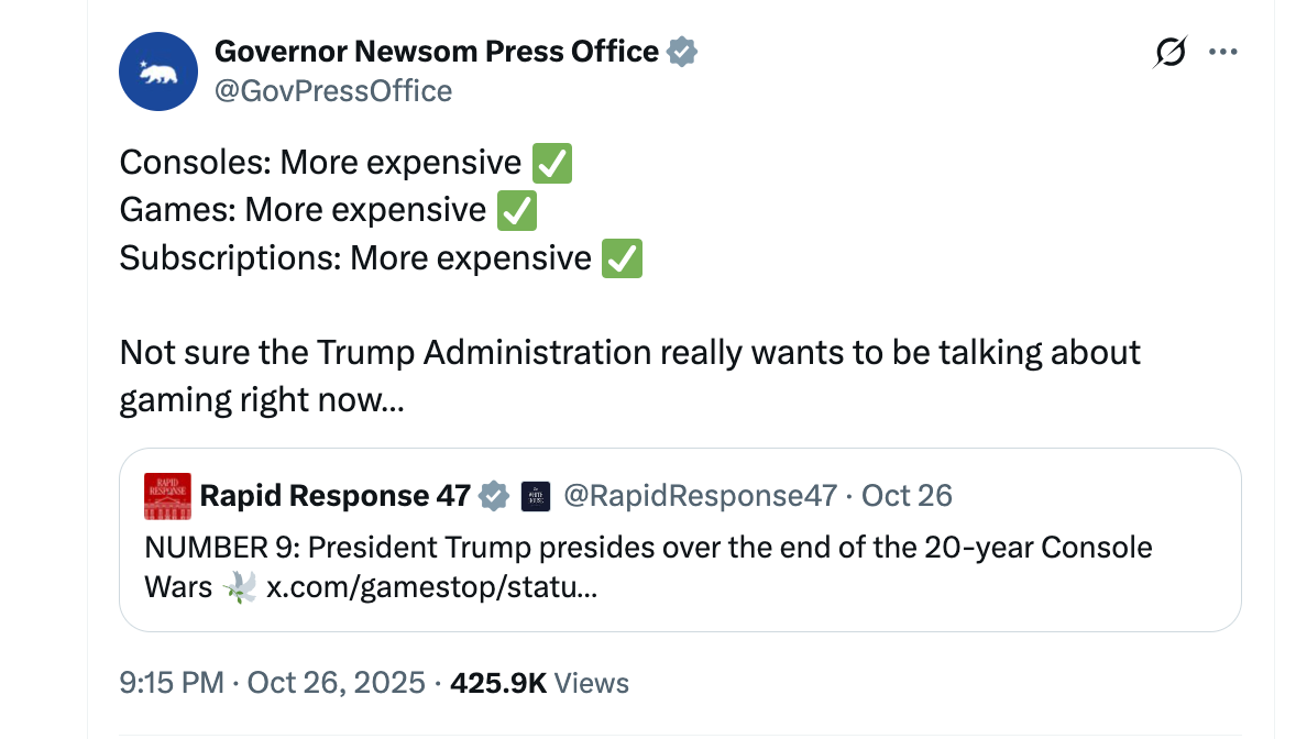 Saturday: Meme-posting game retailer GameStop posts to X that the console wars are over.