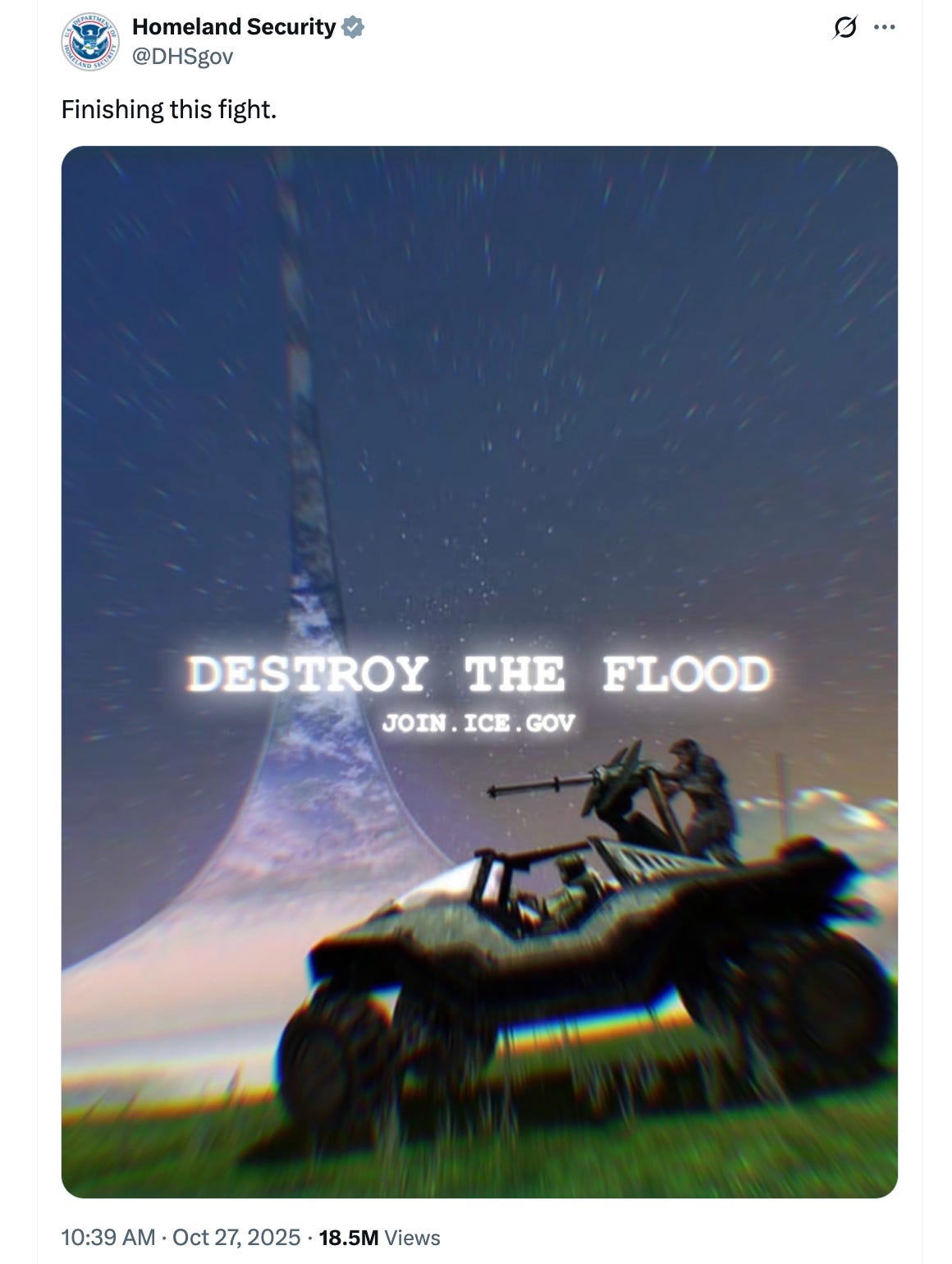“Finishing the fight,” DHS posted, referencing a slogan from the 24-year-old sci-fi military shooter series.