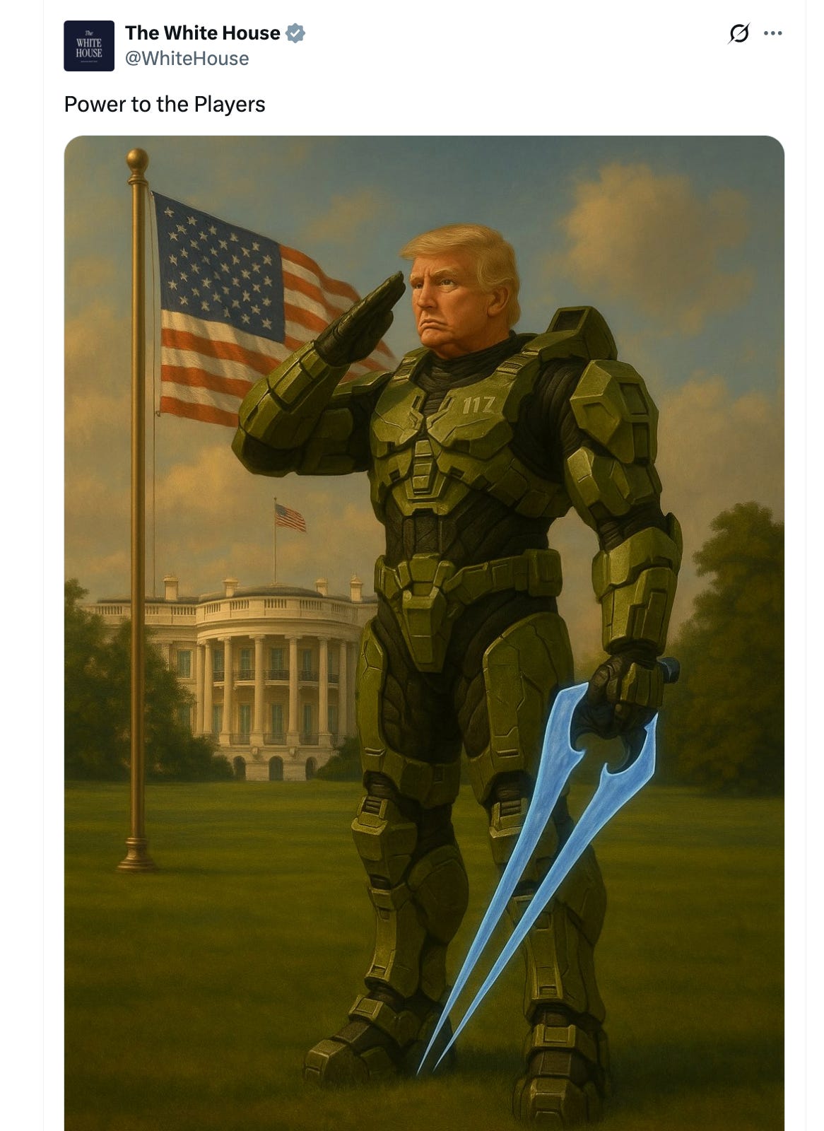Over on the Halo subreddit, the mods allowed a break from their “policy to remove politics and AI slop.” Wrote one commenter: “God I’m so tired of the White House acting like an edgy 17 year old.”