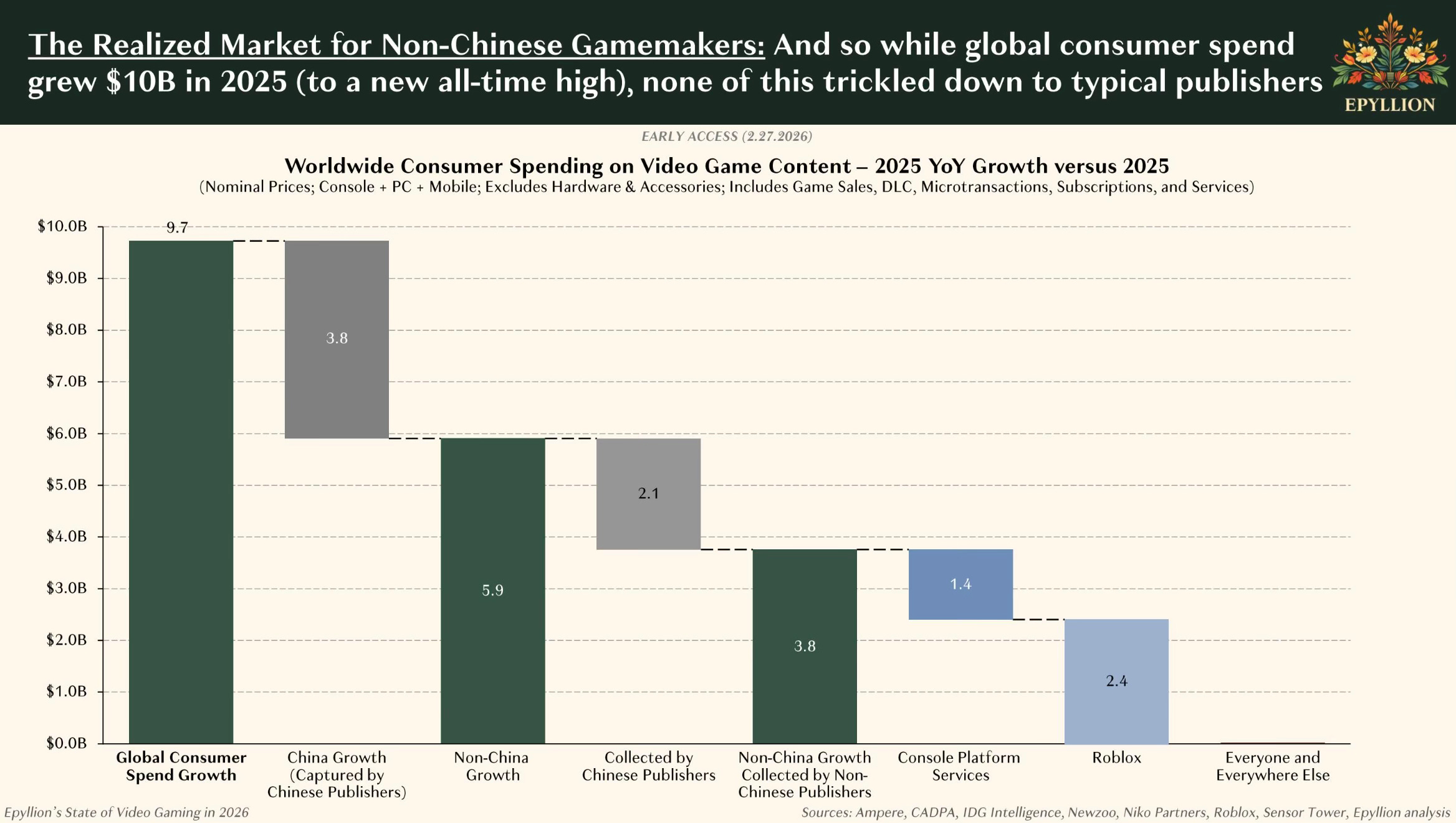 On the left, you’ll see actual games industry revenue growth in 2025 (yes, it went up), but then Ball subtracts growth from a few sectors to see what’s left.
