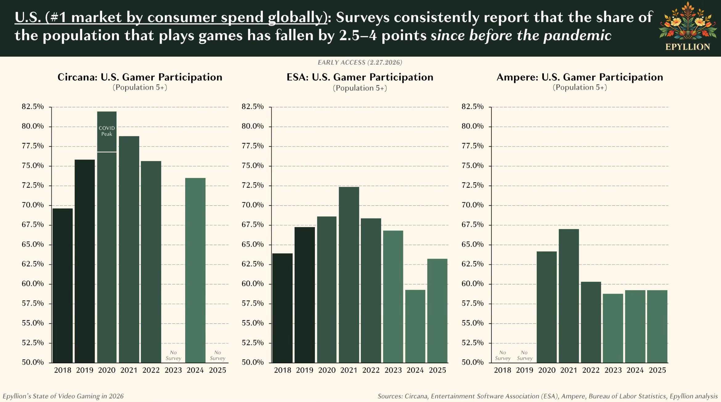 For example, here’s a triple-chart showing the declining percentage of people in the United States who play video games:
