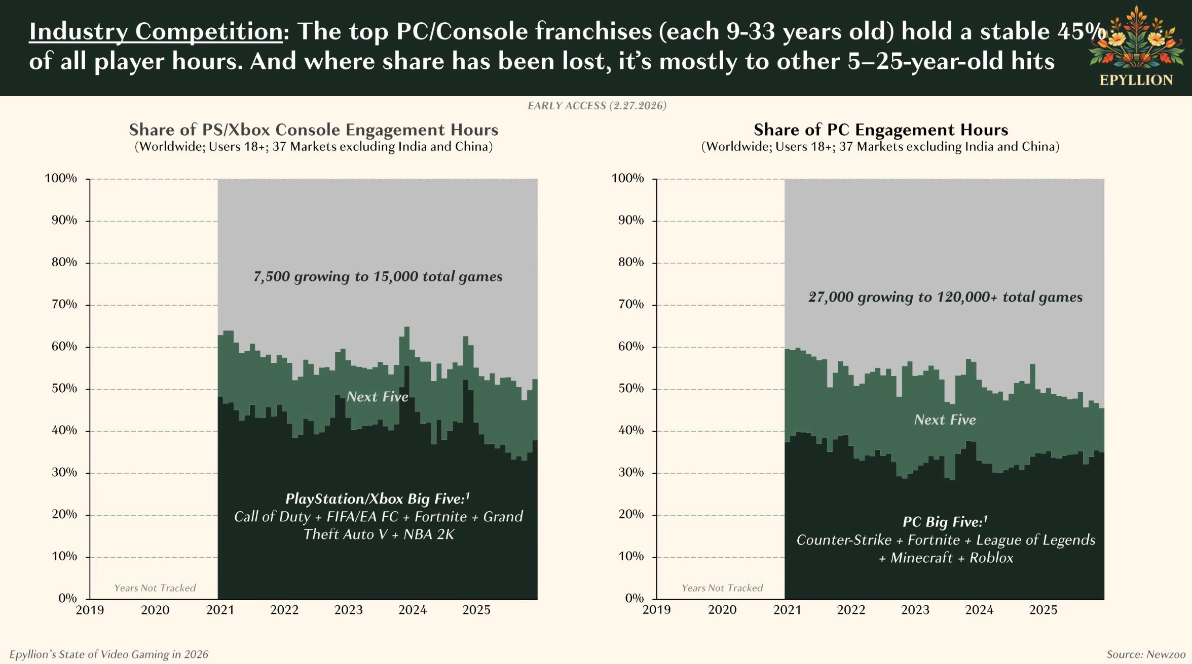 Here’s a chart showing how just 10 games in a given year account for half the playing time on PlayStation, Xbox and PC, year after year.