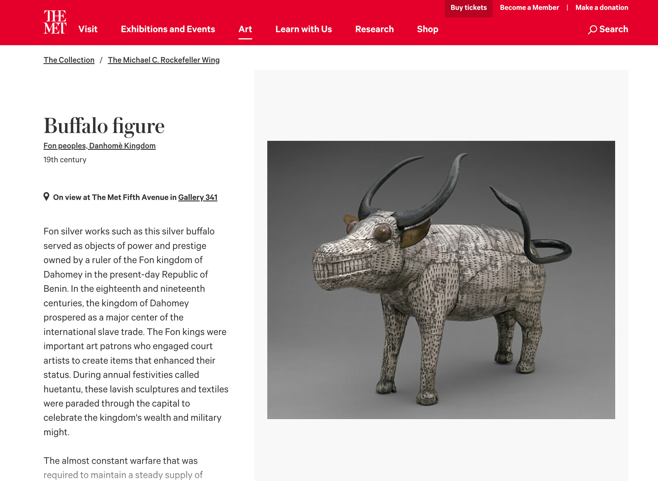 About the buffalo figure, though, no other information appears to be available than what the Met has already stated. The French military “collected” it. It passed through collectors. It was gifted to the museum.