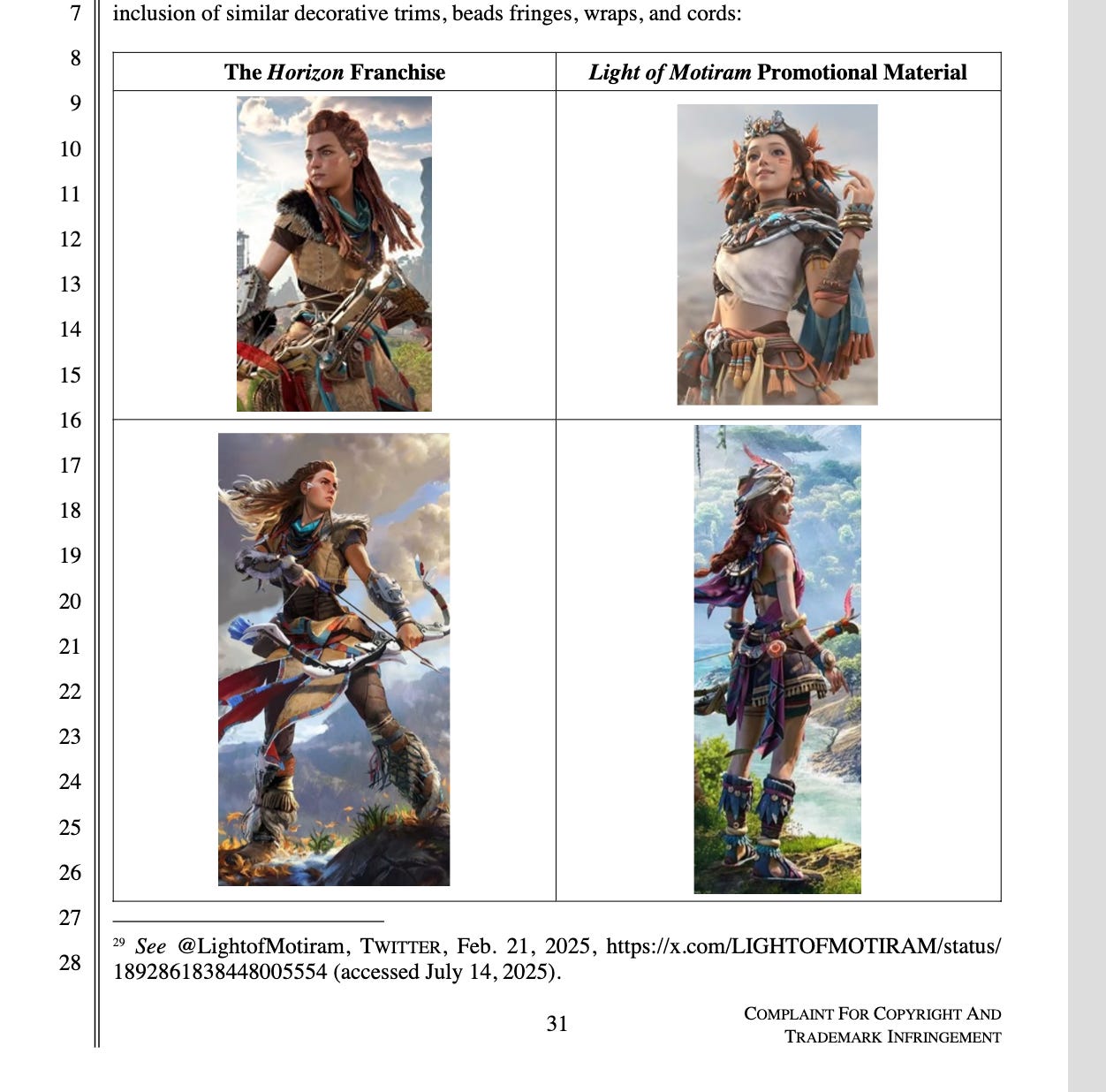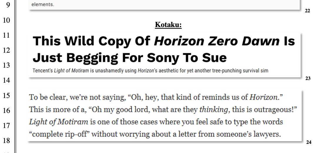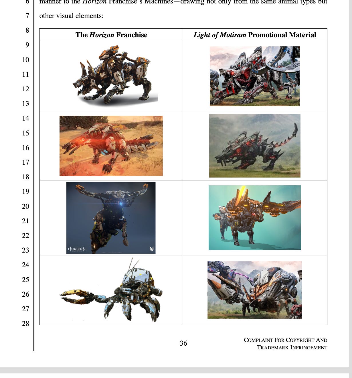 In the suit, Sony’s lawyers have a field day with side-by-side comparisons of the released Horizon games and pre-release promotional glimpses of Motiram…