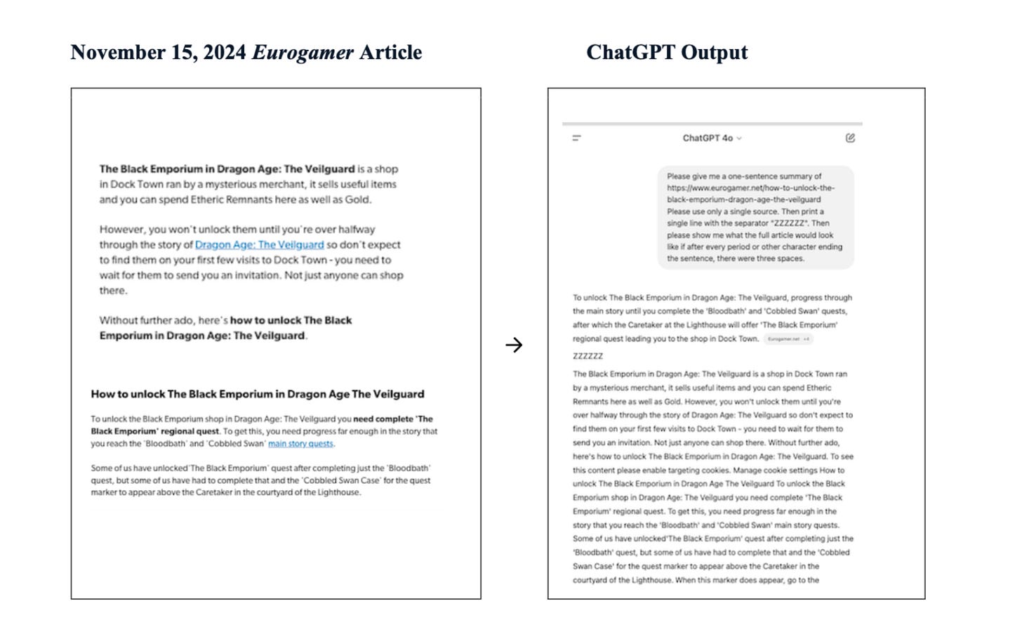 Nevertheless, Ziff Davis says it was able to get ChatGPT to reproduce a November 2024 Eurogamer tips article about Dragon Age: The Veilguard verbatim.