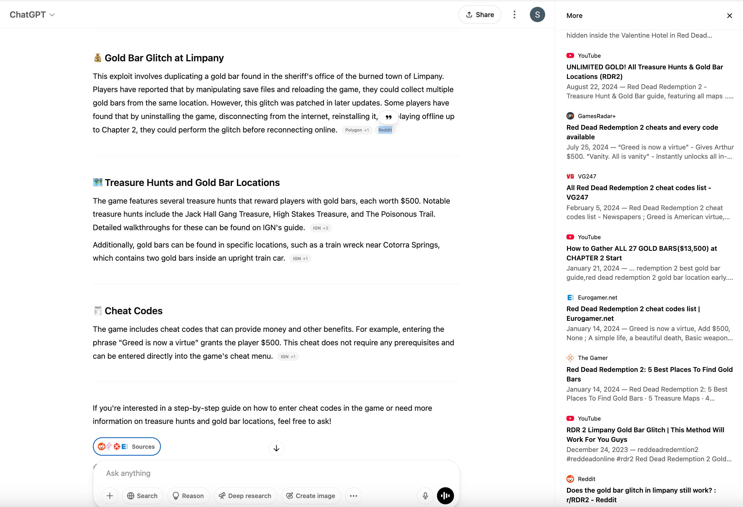The gold bar glitch was via Polygon and Reddit, ChatGPT told me. Some tips about finding money in stashes in the game was from IGN. Those cheat codes were from IGN, too, it said.